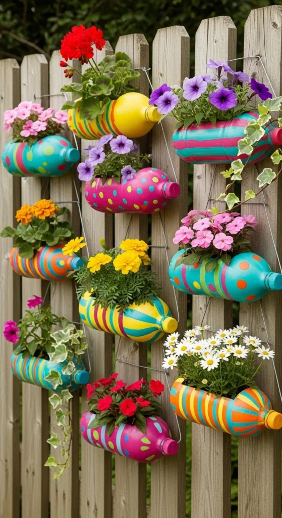Cut and paint old bottles to create hanging planters. Let each child decorate one. It’s a great reuse project and adds color to fences or balconies.