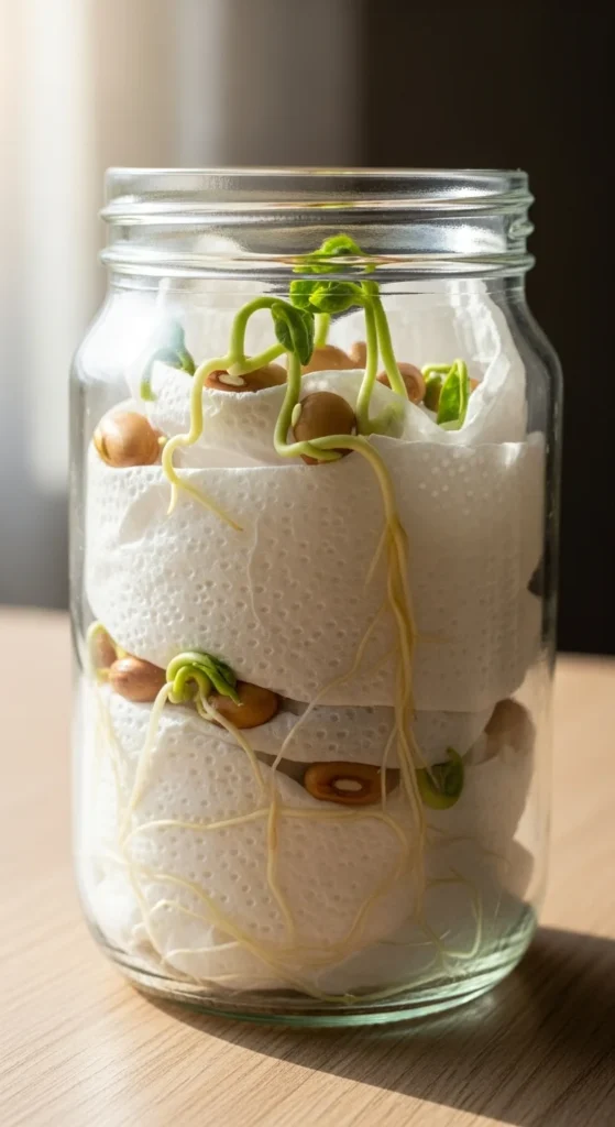 Use a clear jar lined with damp paper towels to watch bean seeds sprout. Kids can see roots grow daily — a perfect mix of fun and science.