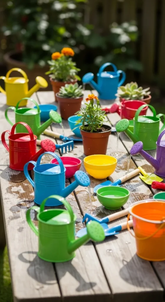 Set up a watering table with small cans or cups. Kids can learn when and how much to water plants while playing in the process.