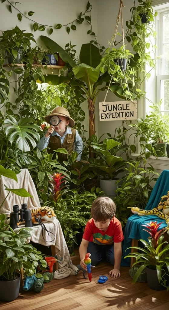 Fill a corner with tropical-looking plants like ferns and palms. Kids can pretend it’s their own jungle to explore — perfect for imaginative play.