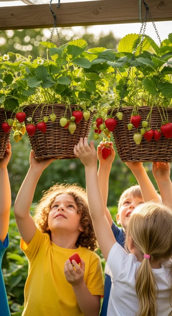 Strawberries are perfect for kids — sweet, easy, and quick to grow. Hanging baskets keep fruits clean and safe from pests.