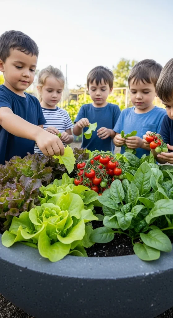 Use a big container to grow greens and cherry tomatoes together. Kids can snip fresh leaves for salads they’ll actually want to eat.