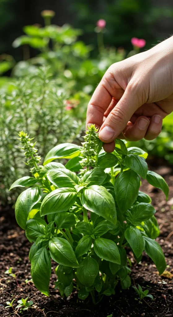 When basil starts to flower, pinch off the blooms right away — flowering can make the leaves taste bitter.