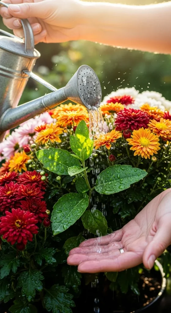 - During hot spells, daily watering might be needed for container mums.