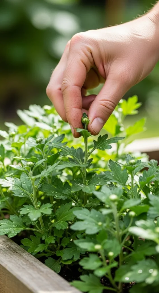 One of the secrets to long-lasting, lush chrysanthemums is pinching. It might feel counterintuitive to pinch off buds, but it helps the plant grow bushier and produce more blooms later.