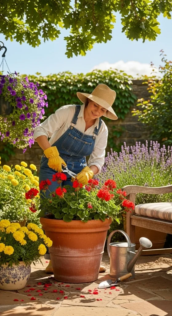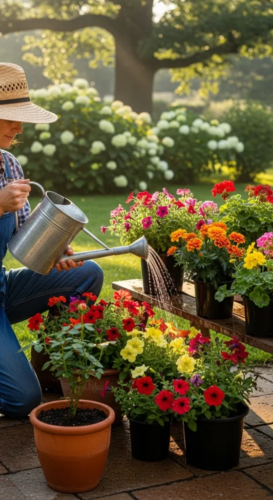 Container flowers dry out faster than garden beds, especially in summer. Consistent care keeps them lush and blooming.
