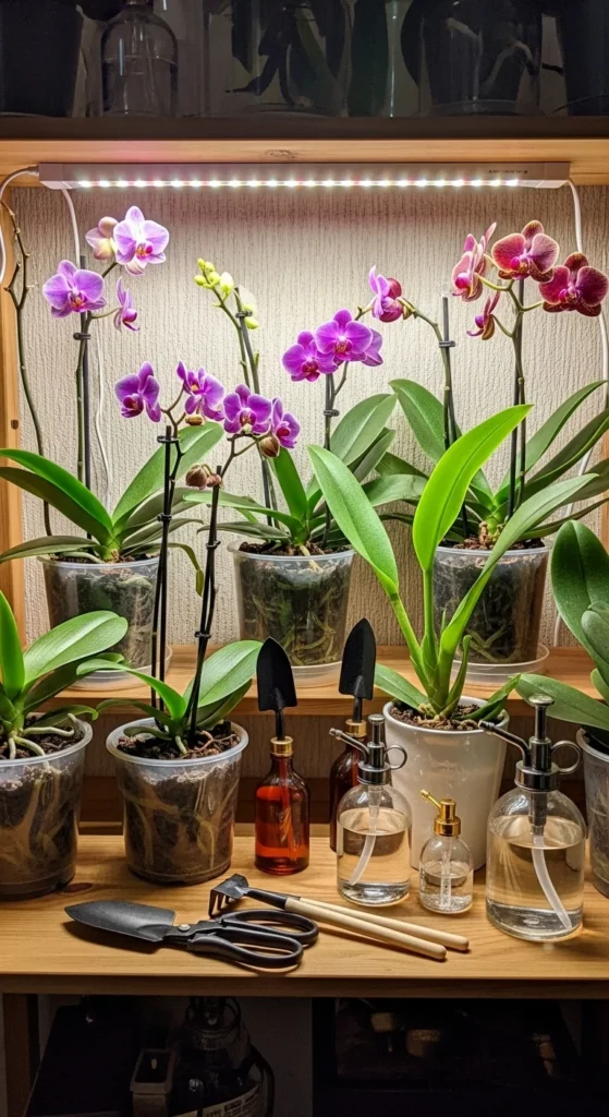 If your home doesn’t get enough natural light, a grow light can make all the difference. Position it about 12 inches above the orchids and run it for 12–14 hours a day.