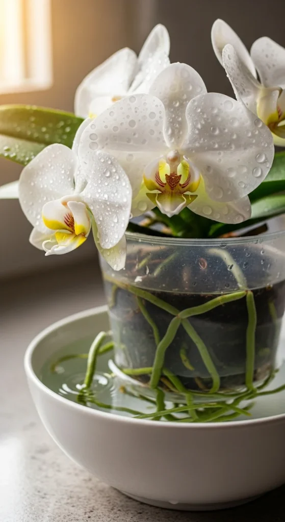 Pro Tip: Use the “soak method.” Place the orchid pot in a bowl of water for 10–15 minutes, then let it drain thoroughly. This ensures even hydration without drowning the roots.