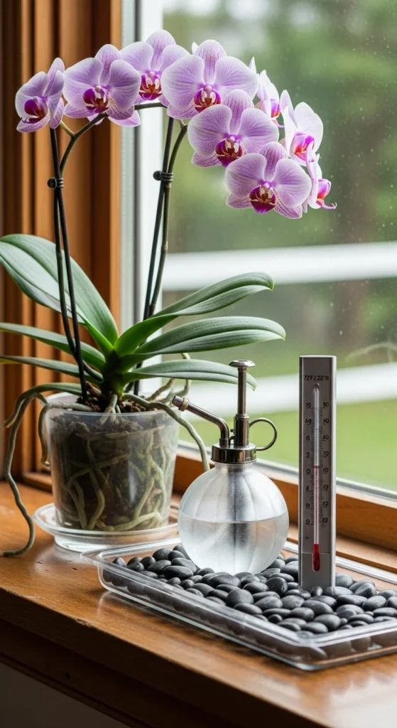 Orchids love humidity between 40–70%. If your indoor air feels dry, try these simple tricks: