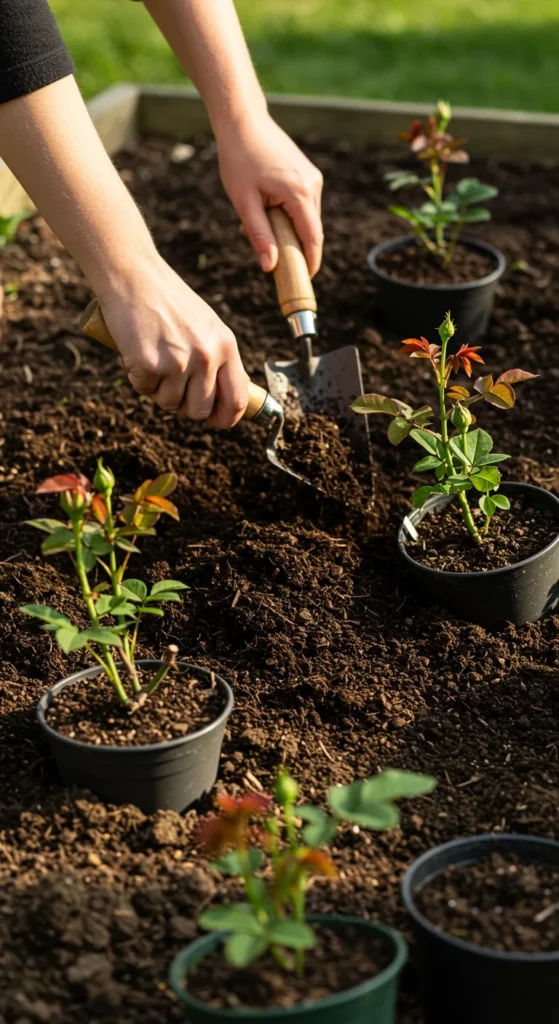 Roses thrive in fertile, well-draining soil. Before planting, enrich the ground with compost or aged manure.