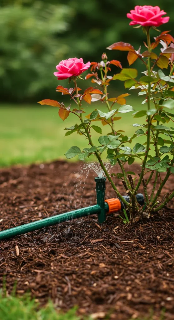 Roses prefer deep watering at the base rather than light sprinkling on the leaves. Wet foliage encourages disease.