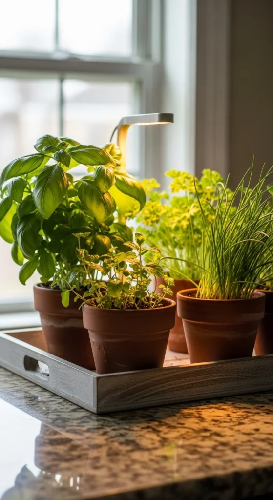 A countertop herb station can keep herbs going when window light is weak or the indoor layout blocks the sun. A small grow light above compact pots gives more control and makes indoor herb gardening possible in kitchens, offices, and apartments that do not have ideal windows.