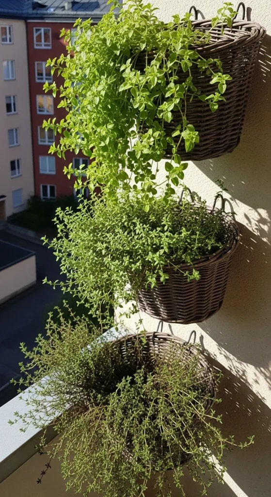 Hanging baskets are a clever way to use empty air space on balconies, porches, and patios. Instead of crowding the floor with more pots, the herbs hang above head height or at railing level. This is useful in places where walking room is limited but hooks or beams are available.