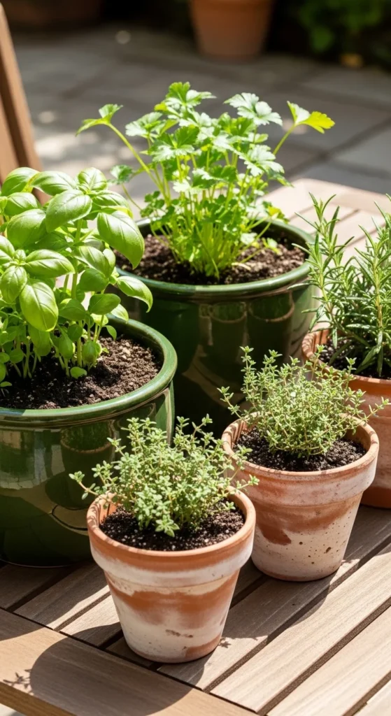 A budget-friendly setup can come from a few basic clay pots in mixed sizes instead of one large expensive planter. Group three or four together for a fuller look. Place the tallest herb in the back and trailing thyme or oregano in front. That makes the cluster easier to harvest and nicer to look at.