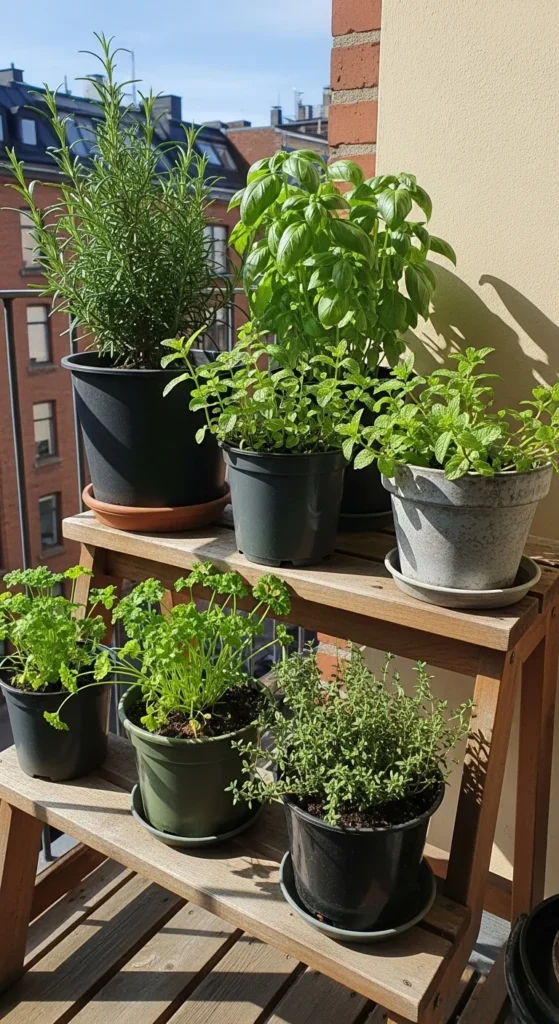 A lower-cost version can come from a basic folding ladder shelf, a reused step stool, or a plain plant stand. Add trays under pots if the balcony floor or shelf surface needs protection. Because the stand is open, herbs are easy to inspect, trim, and rearrange as the season changes.