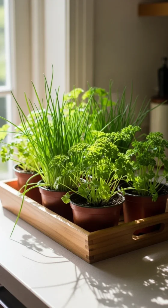 A herb tray near the kitchen door is one of the most useful container setups because it cuts down the distance between cooking and harvesting. If the herbs are easy to reach, they get used more. A simple tray of parsley, chives, basil, and cilantro can make a big difference in daily meals without needing a large garden at all.