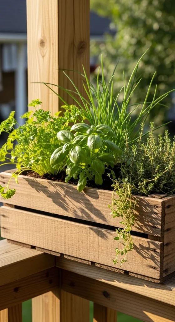 A wooden crate can become a very useful herb box with just a little prep. This idea works well for porches, patios, and balcony corners where a rustic look suits the space. It also gives more planting room than a handful of tiny pots while still feeling manageable for a beginner.