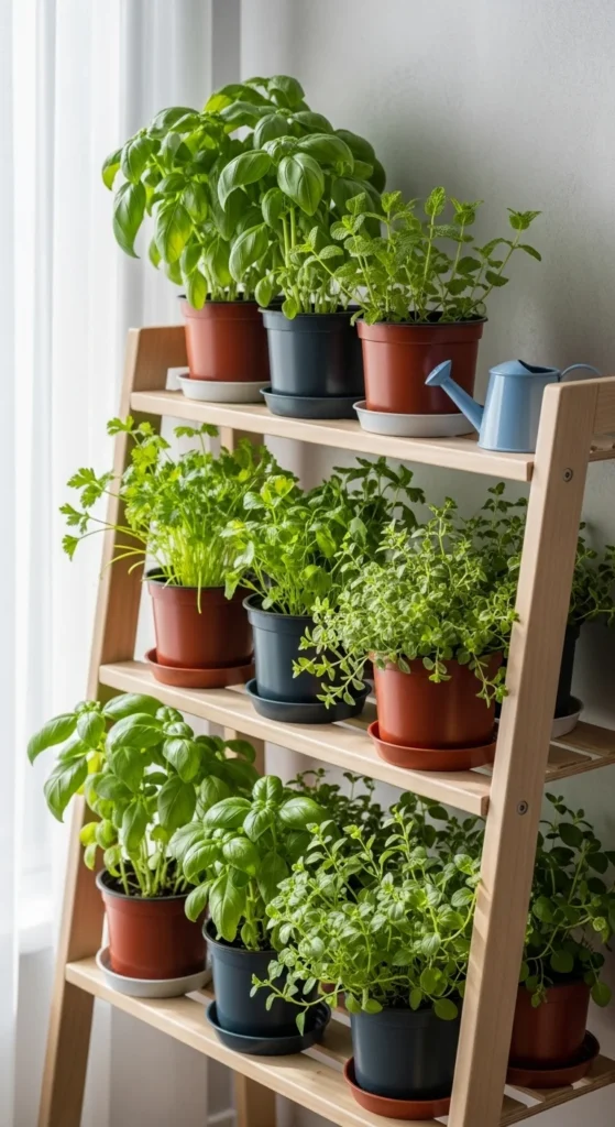 A narrow ladder stand is one of the easiest ways to turn a plain balcony corner into a multi-level herb garden. It takes up very little floor area and holds several pots in a way that feels organized instead of cluttered. For apartment gardeners, this is often a very workable compromise between a few pots and a full vertical tower.