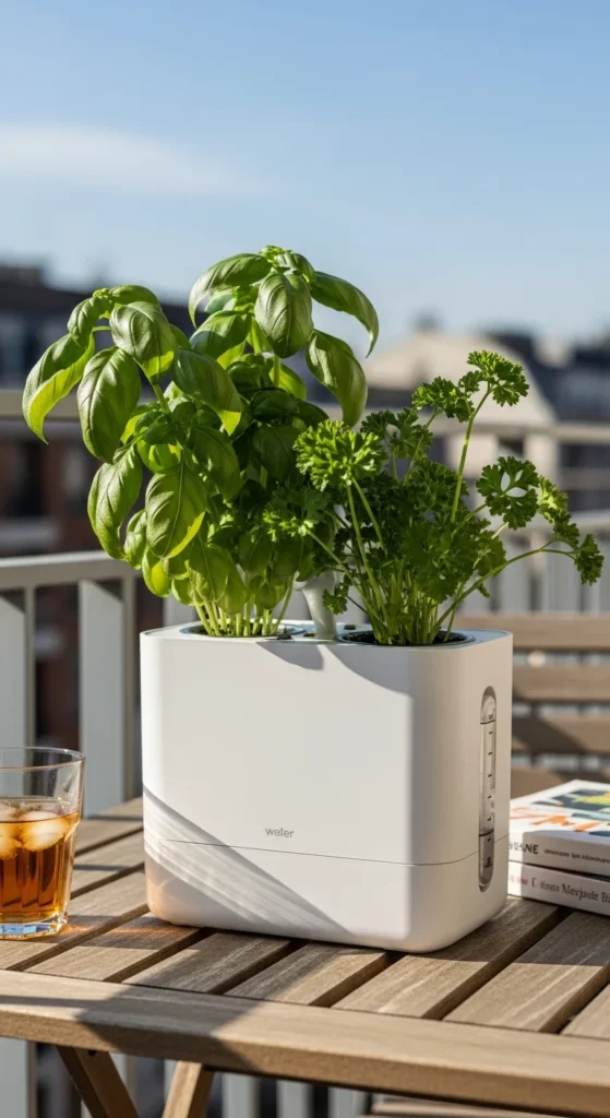 Using a matching set of self-watering pots can make a balcony or patio herb garden feel neat while also helping with moisture control. This works especially well for herbs like basil, parsley, and cilantro that prefer soil that does not swing too hard between soaking and drying.