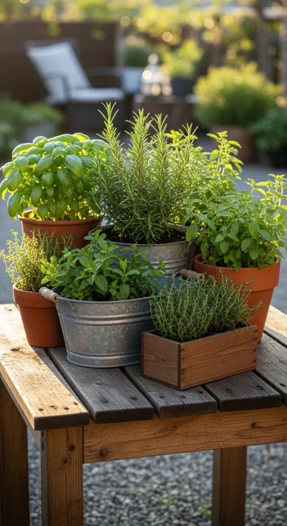 Grouping herb pots together creates a fuller, richer look than scattering them one by one around a patio. A cluster also makes care easier because watering, pruning, and harvesting all happen in one area. This idea suits patios, porches, and sunny corners that need a little life without a major garden project.