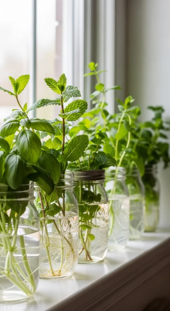 For a tidier look, group three or four jars on a tray near the kitchen window. It feels simple, useful, and a little playful. This is one of the easiest herb gardening ideas for beginners who want a tiny indoor project without buying special gear.