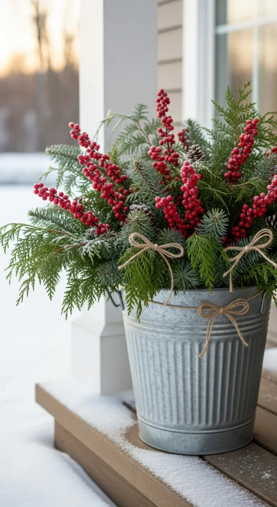 Turn an old metal bucket into a country-style holiday planter. Fill it with evergreen trimmings—pine, cedar, or spruce—and tuck in red berries for color. Wrap burlap around the bucket and tie a big twine bow. This rustic setup costs little if you use trimmings from your yard. Perfect for farmhouse porches or cozy cabin vibes.