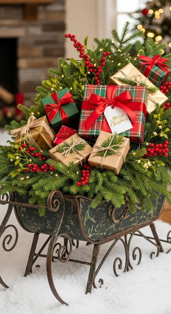 Use an old sleigh as your container! Add fir boughs, berries, and a few small wrapped boxes. It’s playful and nostalgic, bringing a storybook touch to your entryway.