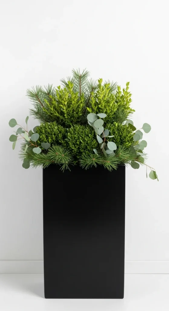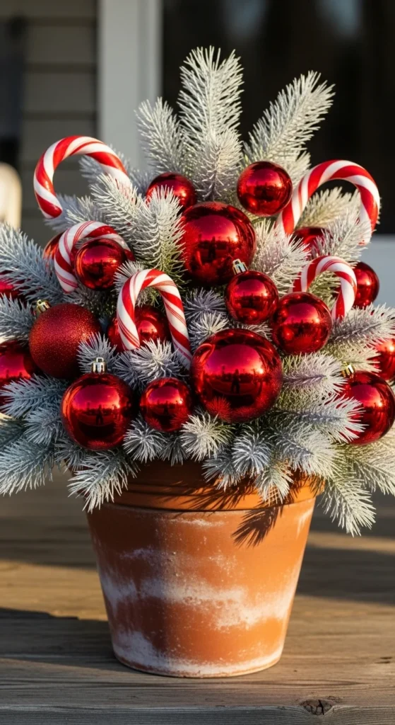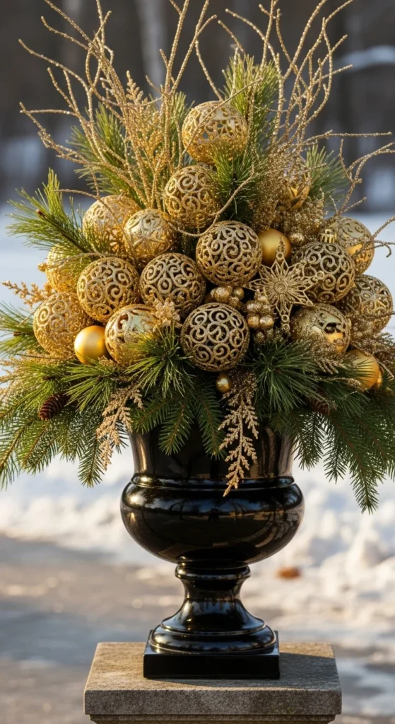 Turn your planter into a metallic showpiece. Mix evergreen stems with gold ornaments and glitter-sprayed twigs. The sparkle catches sunlight and pairs perfectly with outdoor lights. Ideal for modern homes wanting a touch of glam.