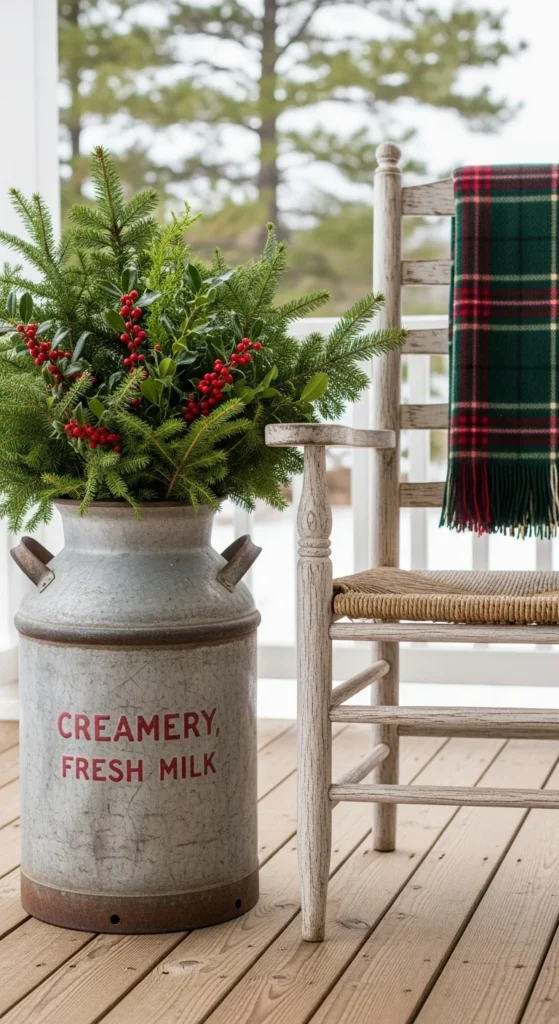 Repurpose a milk can into rustic décor. Fill it with spruce and holly, then add a plaid scarf around its neck. It’s charming, affordable, and full of nostalgic character.