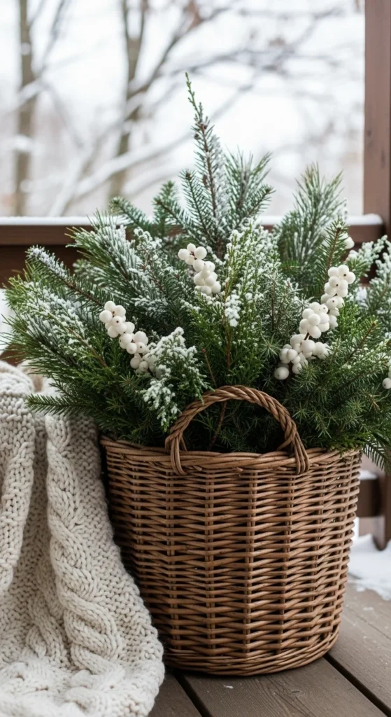 Use a wicker basket for a cozy look. Fill with evergreens and faux snow spray. Add white berries or silver accents for contrast. It’s simple, soft, and full of texture.