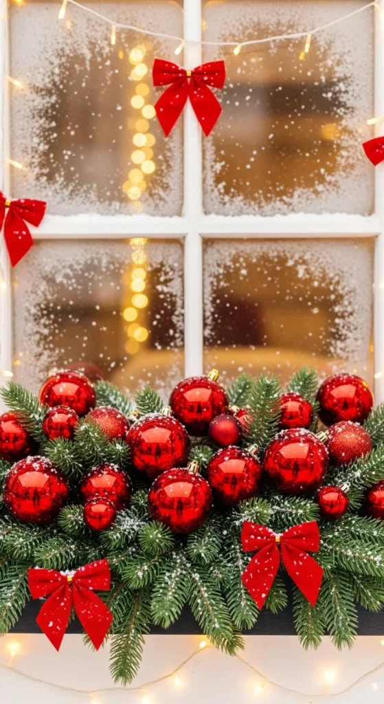 Window boxes bring charm to any home. Layer pine branches, berries, and ornaments, then frame the box with twinkling lights. It’s cheerful and visible from both inside and out.