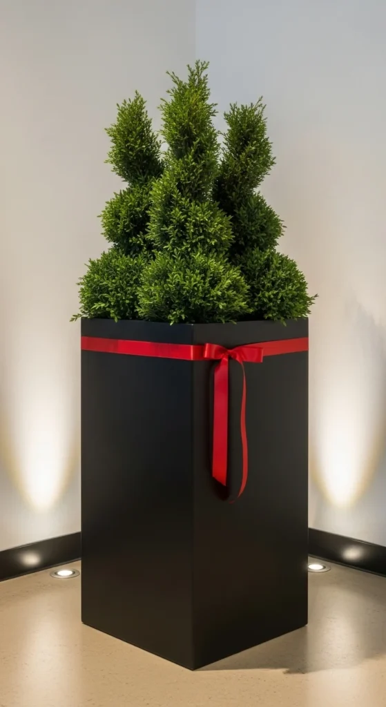 Keep it sleek with structured greens and one bright ribbon. Less is more here. Perfect for apartments or minimal porches where space and color are controlled.