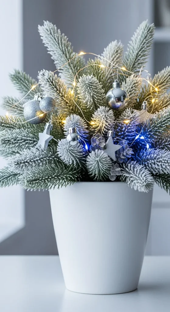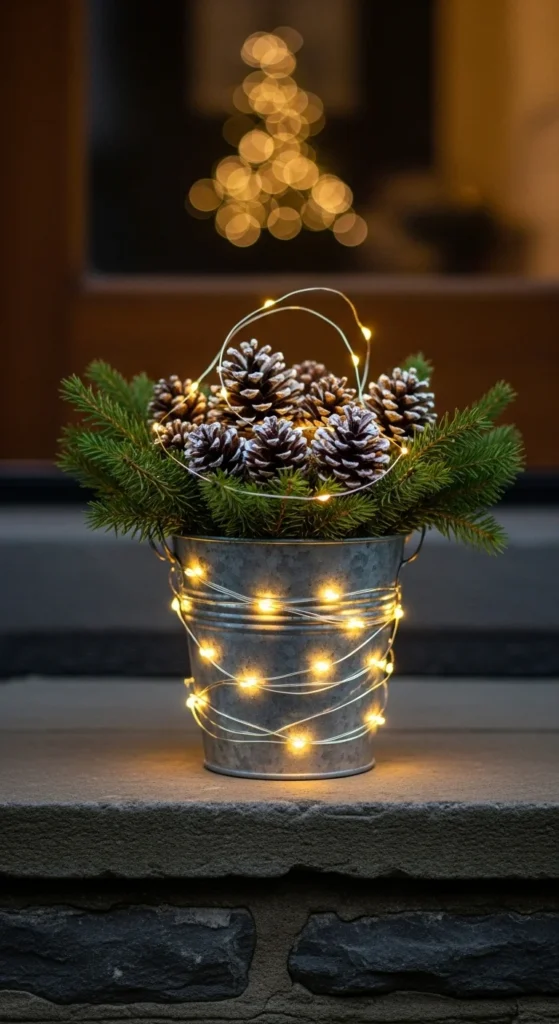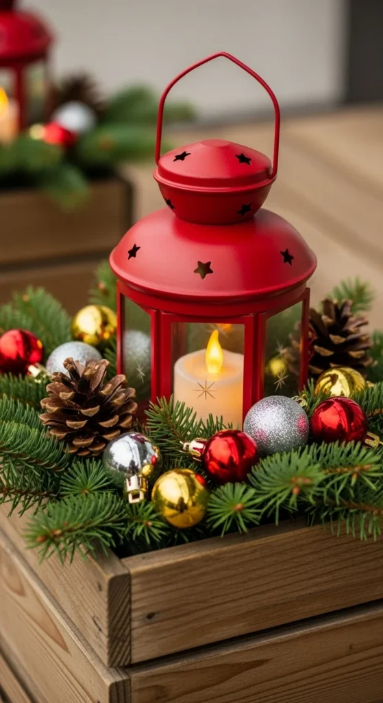 Combine light and greenery for a festive glow. Place a lantern in the center of your pot, surround it with pine branches and pinecones, and sprinkle in mini ornaments. Use LED candles for safety and add ribbon for flair. This setup adds charm without expensive materials.