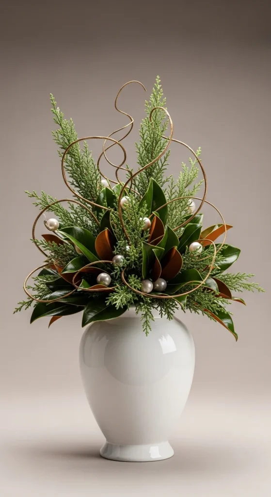 White urns create a clean, polished look. Use glossy greens and magnolia leaves with pearl-toned ornaments. It’s understated elegance that works with any house style.