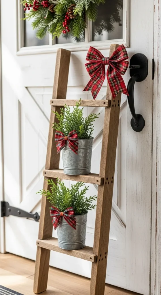 Lean a ladder near your entryway and hang small planters on each rung. Add cedar, berries, and ribbon. It’s creative, inexpensive, and a fun DIY project for the weekend.