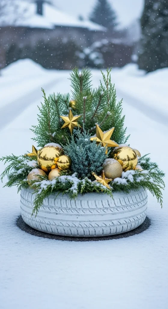 Paint an old tire and turn it into a festive round planter. Add evergreens and gold ornaments. It’s bold, eco-friendly, and adds personality to outdoor spaces.
