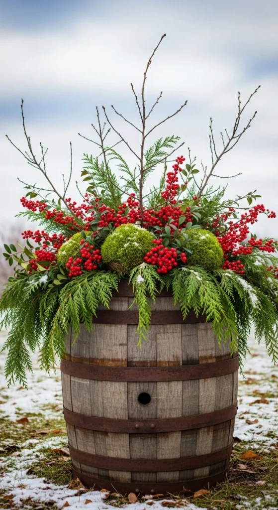 A half barrel gives you room to layer. Start with greens, then add moss and red berries for contrast. It feels natural and lush, with a true winter-garden feel.