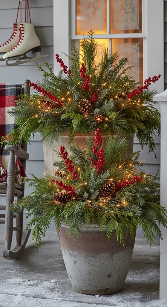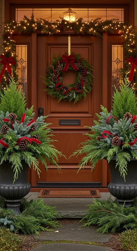 Double up for symmetry. Place matching planters on either side of your door for a grand look. Use evergreens, pinecones, and red ribbons for balance. Guests will instantly feel welcomed.