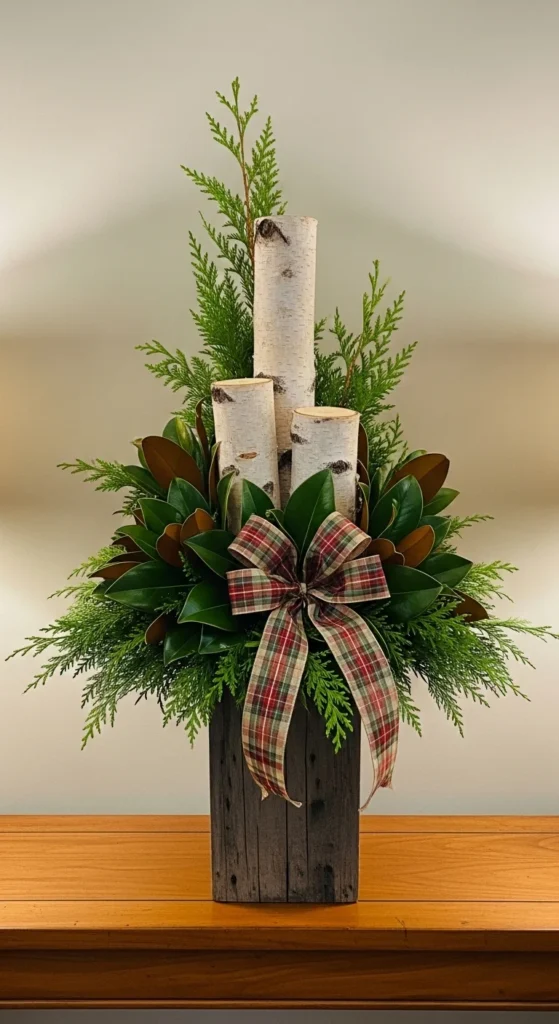 Birch logs instantly say “holiday.” Anchor them in soil, then fill around with evergreens and magnolia leaves for contrast. Finish with a plaid ribbon. It’s an elegant yet simple idea that brings texture and height to your doorway.