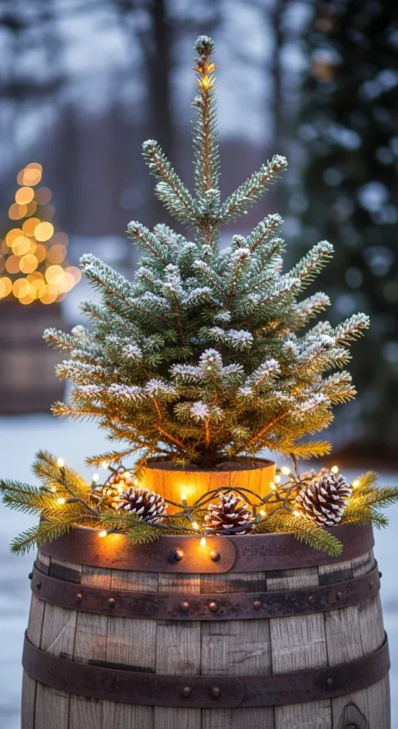 For a budget mini Christmas tree, plant a small spruce in a barrel. Wrap string lights and add pinecones at the base. It doubles as porch décor and a living tree to replant later.