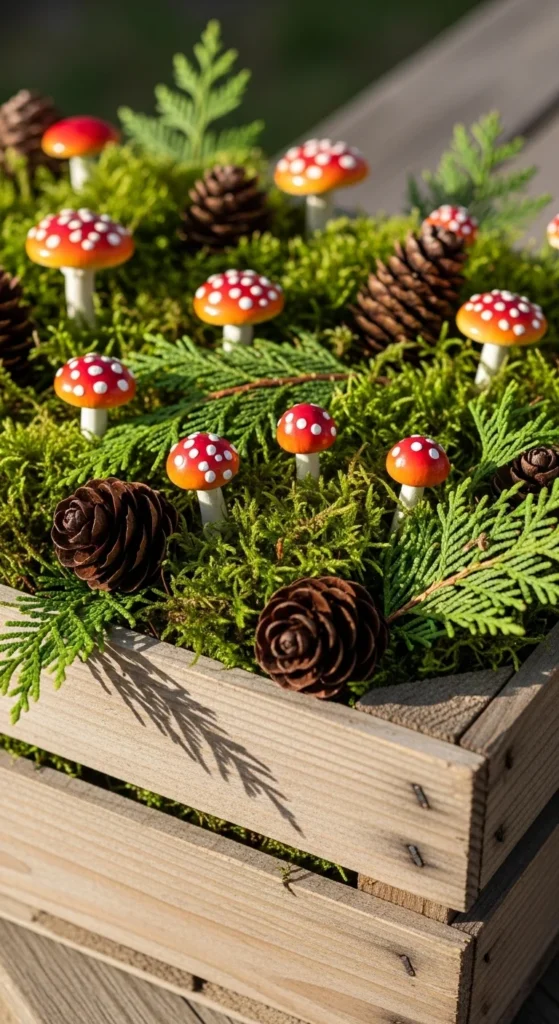 Turn a wooden crate into a forest scene. Add moss, pinecones, and small faux mushrooms for a woodland theme. Layer textures to keep it interesting—great for garden lovers who enjoy DIY projects.