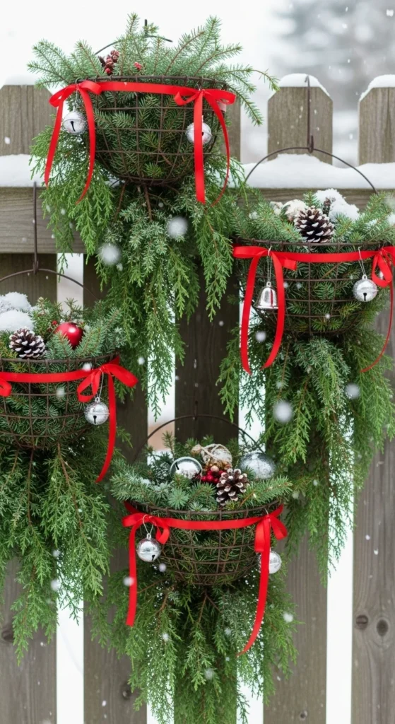 Don’t forget vertical space! Fill hanging baskets with trailing cedar and ribbon bows. Use waterproof ornaments for sparkle. These planters make balconies or small porches instantly festive.