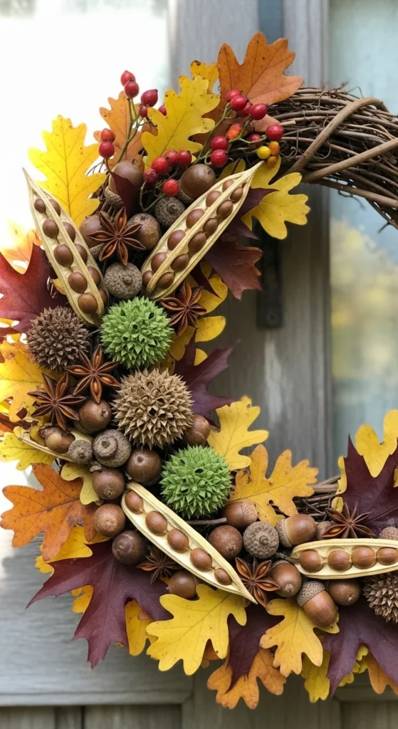 Collect acorns, pods, and fallen oak leaves for a woodland look. Glue them onto a grapevine base in layers. This earthy wreath fits cozy cottages or farmhouse doors. Add a burlap bow for texture.
