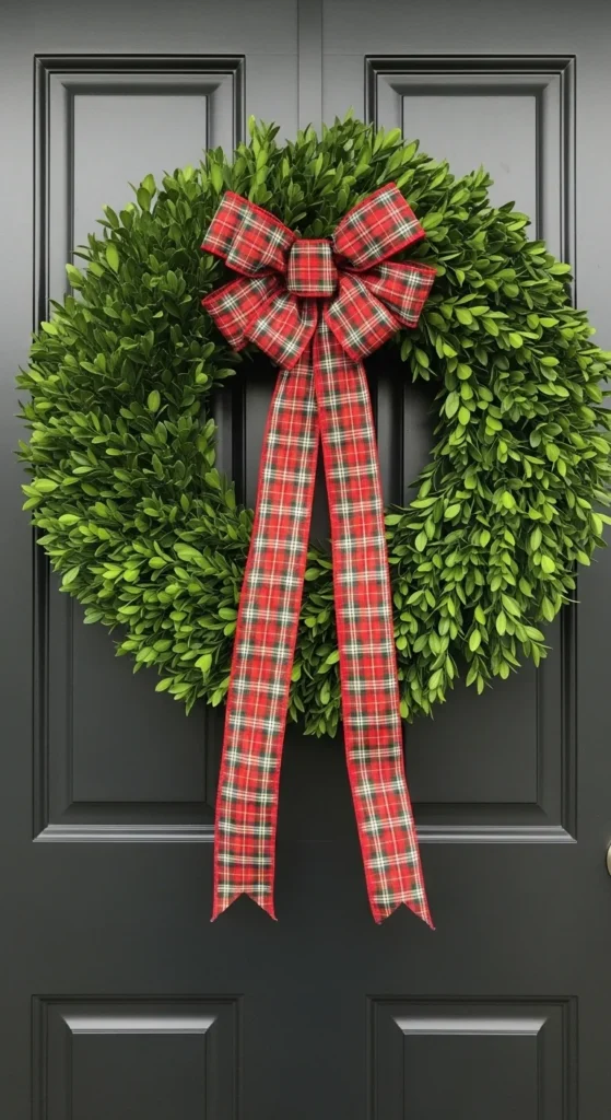 Boxwood stays green and dense all winter. Clip branches and layer them tightly on a wire frame. Keep it small for indoor use or large for outdoor display. A plaid or velvet ribbon adds the finishing touch.
