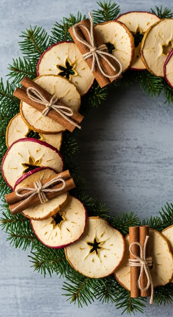 Slice apples, bake them slowly, and mix with greens and pinecones. Their warm tones look cozy and natural. Add cinnamon for a gentle scent. This wreath dries beautifully and feels homemade in the best way.