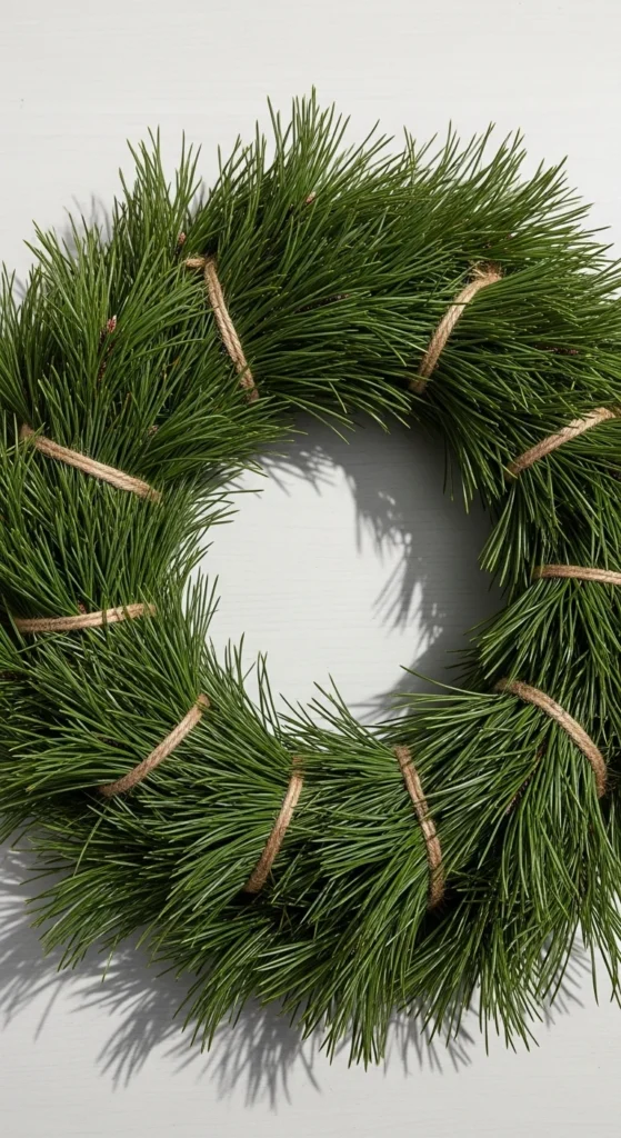 Make a wreath entirely from pine needles for a sleek, natural texture. Bind them with thin jute and shape into a clean circle. Add a few small cones or berries for detail. It smells amazing and feels earthy.