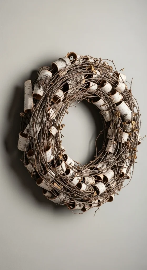 Birch bark has stunning texture and color. Glue or wire bark pieces around a base, adding small twigs for depth. It’s modern and minimal, fitting well with Scandinavian holiday décor.