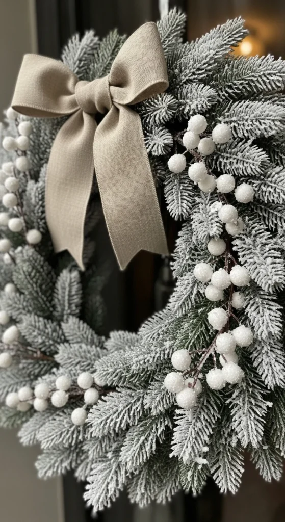 Spray evergreen branches lightly with faux snow for a frosted touch. Add white berries or small pinecones for softness. It brings a wintry sparkle to doors without feeling overdone.