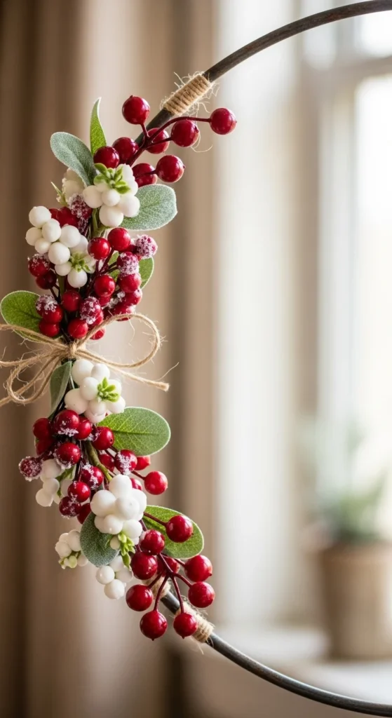 For a modern touch, decorate only half of a metal hoop with berry clusters. Leave some space for balance. It’s simple, stylish, and easy to hang indoors or outside.
