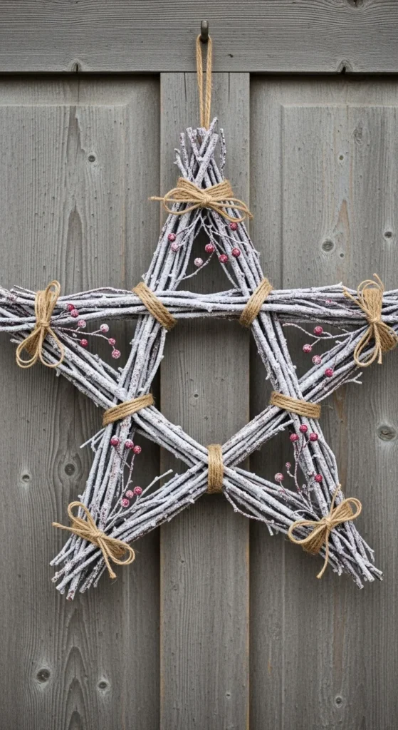 Shape twigs into a star, secure with twine, and brush with white paint for a snowy look. It’s simple, lightweight, and charming. Hang it indoors or outside for rustic holiday décor.